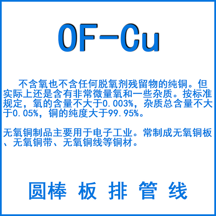 0F-CU無氧銅是不含氧也不含任何脫氧劑殘留物的純銅。但實(shí)際上還是含有非常微量氧和一些雜質(zhì)。按標(biāo)準(zhǔn)規(guī)定,氧的含量不大于0.003%,雜質(zhì)總含量不大于0.05%,銅的純度大于99.95%。根據(jù)含氧量和雜質(zhì)含量,無氧銅又分為一號和二號無氧銅。一號無氧銅純度達(dá)到99.97%,氧含量不大于0.003%,雜質(zhì)總含量不大于0.03%;二號無氧銅純度達(dá)到99.95%,氧含量不大于0.003%,雜質(zhì)總含量不大于0.05%。
